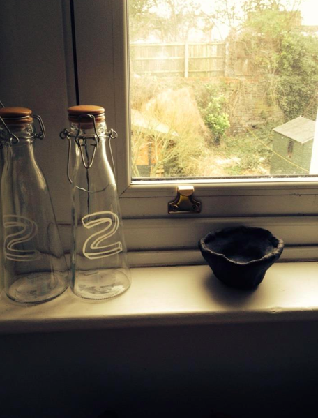 In the spare room with the raku fired pinch pot.
